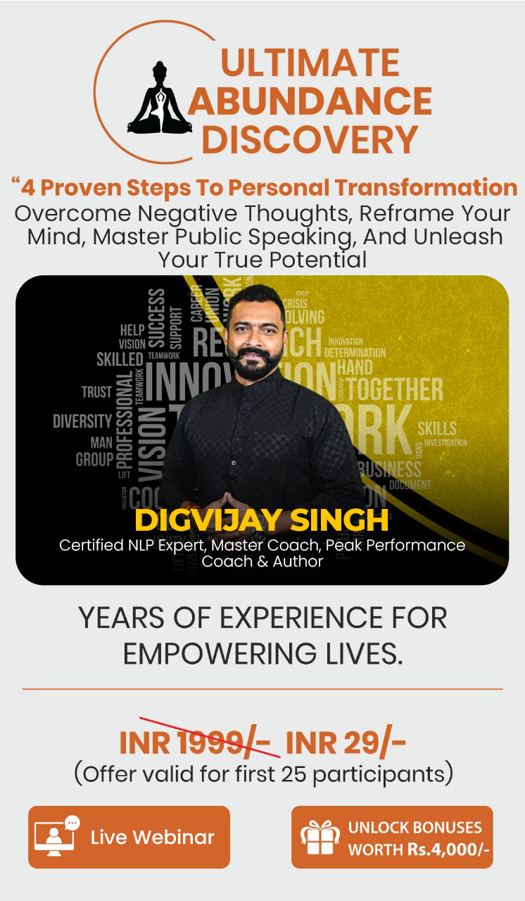 Digvijay Singh is a seasoned Certified Neuro-Linguistic Programming Expert, Certified Master Coach and a passionate meditator based in India. With a passion for life, his two-decade journey includes a success-ful 18 years career in a Media Industry as Anchor.